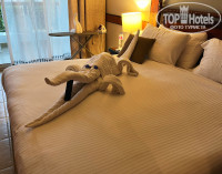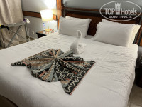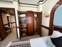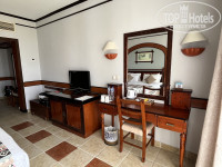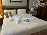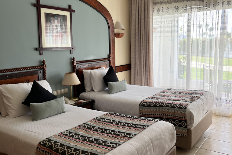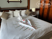 Прибыли в районе 7-8 часов утра, от аэропорта ехать минут 10-15. Нас угостили приветственным напитком, предложили влажные полотенца. Заселили сразу, но номер нам не понравился-мы хотели 2й этаж, чтобы можно было спать с открытым балконом-поменяли без проблем на номер в другом корпусе. Но, правда, пришлось побегать раза 3 до ресепшена, потому что карта-ключ не срабатывала, причем сначала вдвоем, а потом в компании сотрудника отеля. В дальнейшем регулярно присутствовала проблема с ключом: когда мы вечером возвращались с пляжа, он не срабатывал, даже не смотря на то, что лежал отдельно от телефонов, и размагничиваться по идее не должен был. Приходилось каждый раз бегать на ресепшн. У нас сложилось ощущение, что это происходит после визита уборщика, может какой-то глюк в замке после открытия его универсальным ключом. В номере: двуспальная кровать с удобным матрасом и удобными подушками (или две полуторных кровати), прикроватные тумбочки, шкаф (есть вешалки), туалетный столик, комод, телевизор (не включали), кондиционер, весы, бесплатный сейф, холодильник (у нас внутри была только вода, в отзывах читала что должны быть лимонады, но нам они всё равно без надобности); в небольшой прихожей журнальный столик и кресло. Есть чайник, чашки, кофе, чайные пакетики, сливки, сахар. В санузле ванна, раковина, унитаз с гигиеническим душем, фен. Есть жидкое мыло, шампунь, кондиционер и лосьон для тела. Ватные палочки и ватные диски были, но их не пополняли. Тапочек и халатов нет. На балконе два стула и столик, есть светильники, если захочется посидеть вечером. Есть гладильная доска, утюг по запросу (сначала принесли нерабочий, но по звонку тут же заменили на новый с биркой). В номере всё работало исправно; мебель тоже не напрягала своей усталостью. Вид с балкона на внутренний дворик с лужайкой. Слышимость-первые ночи вообще никого не слышали, спали как убитые, в одну из последних было слышно как кто-то по соседству двигает мебель и катит чемоданы, но спать в итоге не мешало. Из номера из ценностей ничего не пропадало. Уборка-наверное нормальная😄 песка не видела, босиком в номере не ходили, затрудняюсь с оценкой. Постельное бельё было чистейшим и свежим. Полотенца меняли каждый день. Оставляли уборщику шоколадки «Алёнка» или доллар-крутил фигурки из полотенец на кровати. Долларам явно радовался больше, судя по сложности фигурок)