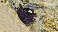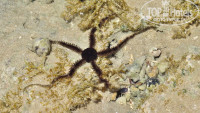 Девушка сидит в воде во время прилива, мы были в первой половине июля, прилив начинался после обеда. Во время отлива так сидеть не интересно, но воду с моря принести можно, зайдя с берега немного дальше. Есть детские бассейны на этот период. Так сидеть можно и ребёнку, и даже зайти в воду примерно на два-три метра по песку. Песочек там шершавый, но вполне нормальный. Но всё это во время прилива. Дальше начинаются природные как бы плиты, ровные, шершавые, местами с небольшими ямками, метров на 150 вглубь моря. В этих ямках можно увидеть рыбок, морских ежей и звёзды. Рядом с берегом их нет, они немного дальше, метров с 15... 20 появляются. Это результат отлива, живность не успела уйти и остаётся в воде в этих углублениях до следующего прилива. Дальше идёт песок с мелкими и низкими мягкими водорослями. Там начинается лагуна, это уже чистый мягкий песок без водорослей и глубина по щиколотку, затем плавно глубже. Вода моря на всём пути и в лагуне идеально прозрачная. Лагуна большая. Там все и купаются, но в основном спускаются туда с пирса, в лагуну есть два спуска с пирса, это по пирсу на расстоянии 260 м от берега (замер по карте со спутника). На спуске в лагуну, на пирсе, есть шкафчик с ячейками для сумок и обуви, проблем с этим не было. Спускаясь в лагуну с пирса, мы видели как подают с пирса детей тем, кто уже в воде. Около пирса в отлив уровень воды примерно по грудь, в прилив до плеч, но пройдя несколько шагов открывается простор с песком и прозрачной водой, всегда можно найти место с глубиной как раз для ребёнка и дети там были. Ям нет. Некоторые отдыхающие и даже с детьми, идут до этой лагуны пешочком по воде от берега, идти очень мелко. Мы тоже прогуливались и фотографировали морских ежей и звёзды. Встречаются там по пути и рыбки.