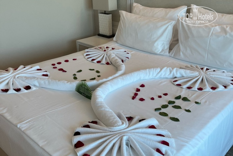 1. Про номер: брали с видом на море , получилось, что и на горы , что оказалось огромным плюсом, номер в основном корпусе. Номер чистый , кондиционер работал отлично, минибар пополняли каждый день, по вашей просьбе могут положить больше того напитка, который попросите. Номера убирали тоже каждый день, все чисто, приятно. Ездили как молодожены, первые 2 дня был номер украшен: на постели лепестки роз. Соседей не слышали.
