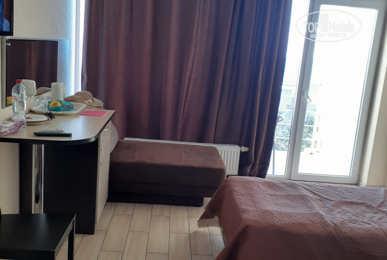 Теперь о плюсах .Доброжелательный персонал , везде чисто , уютно , номер убирают по запросу . В номере ( у нас был стандарт) фен , сейф , полотенца по 3 шт , чайник , посуда , ТВ плазма, конд -р ,Wi-Fi ,балкон и потрясающий вид на море , на Ялту . Лифта , к сожалению , нет , на 4 этаж добирались по лестнице .Но если находишься в номере редко , то это не очень напрягает.Мы объездили окрестности , несколько раз были в Ялте , ездили в Гурзуф , Ласточкино гнездо , Ливадию , Алушту.В общем на месте не сидели.