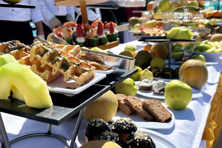 По еде вопросов нет вообще. Много еды, разная кухня каждый день. Морепродукты просто объедение. Много баров. Было бы не плохо еще сделать один бар на пирсе, потому что официанты туда не всегда доходят, и приходится долго ходить. А так все понравилось. Можно записаться в ресторан дополнительно, в отеле иХ несколько.