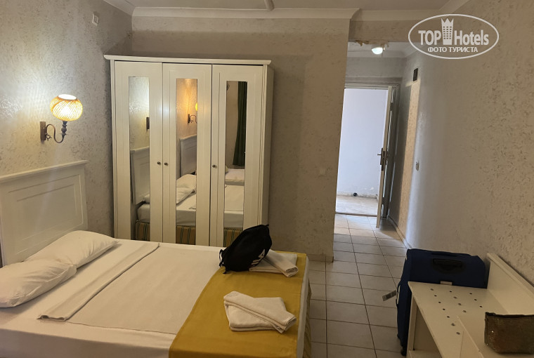 В общем это не отель, а большая помойка. номера грязные,кондиционера у нас номере вообще не было,пол грязный вода, вода в ванной не уходит,кондиционер снят,провода на стенке торчат,постельное грязное,с потолка сыпится штукатурка.В ,типо ресторане,всё стоит на жаре,мухи кондиционера нет,вся еда открыта, мебель вообще оставляет желать лучшего,холодильника ни в одном номере нет,пляж - лежаки уже затасканные,полотенца грязные,заход в море так себе,ну основном галька…..половины напитков нет вообще В общем, я так и не поняла, как там отдыхают люди, их все устраивает.