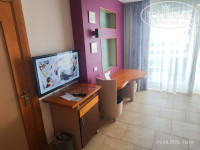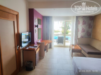Номер: номер у меня был категории DELUXE ROOM SWIM UP, номер 4103. Это номер с личным небольшим бассейном (примерно 5 на 5 метров, глубина 1,4), лежак на балконе и персональные лежаки за бассейном на газоне - если не хочется идти на пляж. Расположение - с видом на море. Рекомендую, очень хорошо вечером поплескаться в бассейне, когда море и остальные бассейны недоступны. Бассейны персональные видел как чистили постоянно днем и промывали фильтр. Номер просторный, есть сейф, чайник с чаем и растворимым кофе+сухое молоко (почему-то по два пакетика, хотя в этих номерах я видел семьи заселялись). Бутылка 1,5 литра воды, гладильная доска с утюгом. Кондиционер центральный, шумноват, но охлаждал хорошо. Панель телевизора, не включал за все время отдыха, мини-холодильник пустой. Две кровати полуторки или одноместные, так и не понял (см.фото), матрас удобный, софа, стол, стул, тумба. Мебель конечно атас, бубушкина, но вся исправна. Ещё поразила дверь к соседям - хоть она и закрыта, но из-за её наличия шумоизоляция отсутствует - слышно в деталях, о чем говорят в соседнем номере). В комнате была одна (!!!) свободная розетка, если заселиться вчетвером - непонятно, как заряжать телефоны?!
