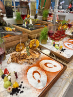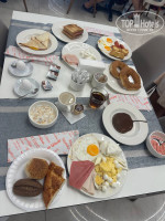 Очень много видов хлеба , различные добавки масла, соусы и так далее. Также много различных овощей и зелени, сырной и мясной нарезки.