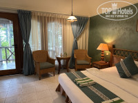 Касаемо, номера, мы жили в Делюкс Скай (номер 246). Расположение бунгало очень удобное. До ресторана/бара/ресепшена идти 2 минуты, но есть и свой минус! Пляж напротив нашего номера не очень хороший, мы там 1 раз поснорклили среди рифов и больше никогда туда не ходили, т.к. там мелководье, когда плаваешь среди кораллов расстояние до них в нескольких сантиметрах. Без ласт с маской или корралок (тапочек) тоже особо не поплаваешь (при входе сразу осколки кораллов). Вообщем, в этой части острова пляж плохой, но начиная от водных вилл до причала супер для снорклинга! Водный мир разнообразен, но кораллы практически все мертвые!!! Рыбок разных видов много, также видели ската орляка, акул и тд. Рыб триггеров очень много (два раза уплывала от них, чуть не укусили). На мой взгляд, надо брать хотя бы кораллки с собой, т.к. идеального песочного дна нигде на острове нет! Далеко не заплыть из-за течения, поэтому самый идеальный вариант - снорклинг. Каждый день снорклили, просто так не плавали.