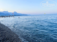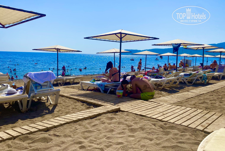До пляжа нужно ехать на шаттле 3–5 минут. Сам пляж чистый, песочно - галечный, вода прозрачная. Лежаков в целом хватало, море тёплое и очень красивое.
