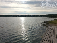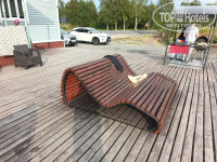 У входа в гостевой дом огромная терраса у воды, очень живописно и мега красиво. Особенно приятно эту красоту воспринимать на волнистом лежаке(на фото). После отлива, видны огромные каменюки, и высота метра потора, так что детишек надо контролить, а то как бы не спланировали на оголенное дно. Запах воды и водорослей при отливе, отбил напрочь всякое желание искупаться. А очень хотелось после аномальной жары днем.