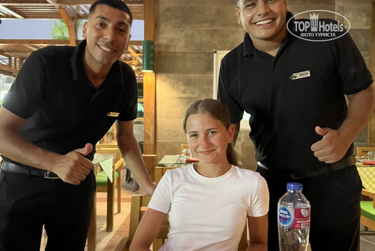 Ребята в а ля кард «Итальянском» вообще - огонь. Со всеми общаются, шутят, носятся. Наблюдали со стороны - всем приветливость и хорошее обслуживание. Грязные тарелки просто мгновенно «растворяются»😃. На фото Махмуд и Абделдим - молодцы! Очень хочется отметить их. Жаль фото не сделали, но у них за столиками посетители постоянно улыбаются.