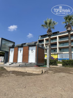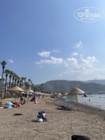 Собственного пляжа нет, но до моря 2 минуты (можно найти свободный уголок у моря бесплатно, можно купить лежак за напиток у баров). До общественного пляжа минут 10 спокойным шагом, там чисто, но зонты почти всегда заняты.