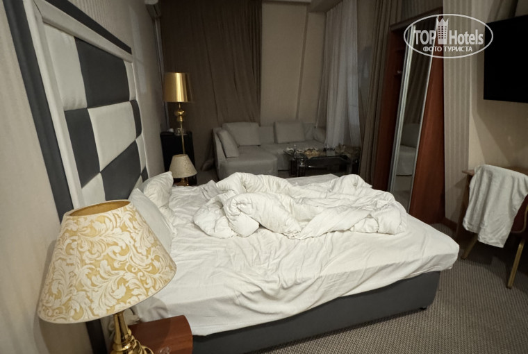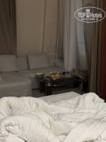 От обычного номера его отличало то, что в углу висело 10 самых дешевых Шаров и бомбочка в ванной. А так же огромная пройденная дырка на диване, неудачно прикрытая подушкой. Обещанного игристого и десерта тоже не было. Донесли все это спустя еще часа полтора, после напоминания администратору.
