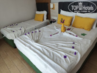 Приехали в отель в 11.00, номер дали сразу. Заранее писала в отдел бронирования с пожеланием корпуса и номера, все пожелания были учтены,что очень порадовало! Спасибо огромное отделу бронирования и девушкам на ресепшене! Номер очень маленький, нет шкафа для одежды, только в прихожей открытые вешалки для одежды, где хранить "трусики, носки", футболки, шорты не понятно. Весь отпуск вещи просто горой лежали на кресле. Подушки высокие и каменные, от чего заклинило шею в первую ночь и спать пришлось на полотенцах. Из номера выход сразу на бассеин и море, что очень удобно. Так же рядом пляжный ресторан с завтраками, обедами и ужинами. Еда достойная,ягненок, говядина, баранина, индейка, курица, гарниры и супы все очень вкусное. Рядом снежки, фруктовая комната и комната для свежевыжатых соков, мороженое .Хороший аквапарк, отличный мини клуб для детей. Большая территория. В главном ресторане были один раз, там очень много людей и очень не комфортно. Хорошо, что мы жили в корпусе D, иначе от такого количества людей как в центральных корпусах, сошли бы с ума! Ну и теперь о главных минусах этого отеля: пляж и море, я 22 раза была в Турции и смело могу сказать, что это самый худший пляж. Очень узкий, песок странно серого цвета, который постоянно перемешиваются с водой и море было не похоже на море, как мутное наше озеро. Шезлонги очень плотно друг к другу, ноги-голова. Количество людей в море зашкаливает, прям филиал Анапы. Ходили на пляж премиума, там людей меньше и шезлонгов свободных больше. Алкоголь, ну...такое себе, хотя в последние дни на барах появился Балантайнс, но он либо сильно разбавленный,либо подделка. Пробовала его и в коктейлях и так, градусов 25 в нем. Остальной алкоголь турецкий,но для 4* это норма, а вот для тех кто купили путевки в резорт, конечно возмущались. Коктейли ужасные, опять же спасал премиум. После ужина ходили туда именно за хорошим алкоголем. Ну главная боль этого отела, Олива бар, отдыхающие в шутку прозвали его "Оливье" бар. После живой музыки начиналась так сказать дискотека с русской старинной музыкой, хотя "Царица", тоже была))). Все 10 дней одна и та же, как будто флешку одну воткнули. И судя по другим отзывам, весь сезон одна и та же. Танцующие человек 20 , а в отеле проживает 6т человек! Стоит сделать выводы администрации. В отеле много молодых семей и вечером родителям там делать не чего. так же в отеле проживают иностранные гости, которые подходили к диджею, просили его поставить свою музыку, он отказывал. Вот к чему там русская музыка, не понятно. Вернулась бы ещё? Большой вопрос, в премиум ходить будет нельзя, в море купаться не комфортно, вечерами делать там не чего. Но, цена у Лонисера, самая приятная и это огромный плюс!