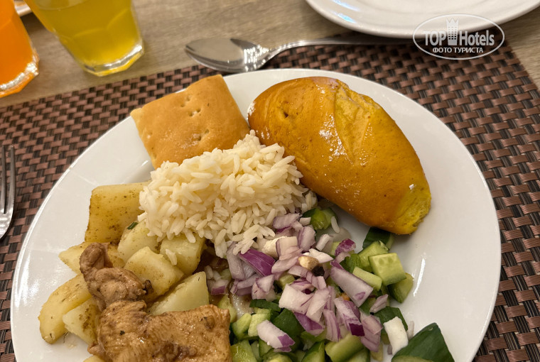 Питание порадовало — выбор большой: мясо, рыба, курица, гарниры, фрукты и десерты. Особенно вкусная выпечка и свежевыжатые соки утром. Иногда блюда повторялись, но всегда можно было найти что-то вкусное.