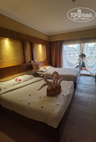 Номер был комфортным, две двуспальные кровати очень порадовали, сплит система работала прекрасно, в ванной тоже все было замечательно и удобно, одновременно можно было принимать душ двоим, так как была душевая кабина и ванна, перебоев с водой не было. Уборка номера проводилась ежедневно + пополнялись гигиенические принадлежности, вода, чай и кофе. За уборку нашего номера отдельное спасибо мальчику Махмуду, который крутил нам лебедей, слонов и пр., было очень приятно заходить в номер после пляжа и наблюдать такую красоту! Отель расположен таким образом, что все номера выходят балконами во внутренний двор, где открывается красивый вид на бассейн и просматривается вся территория.