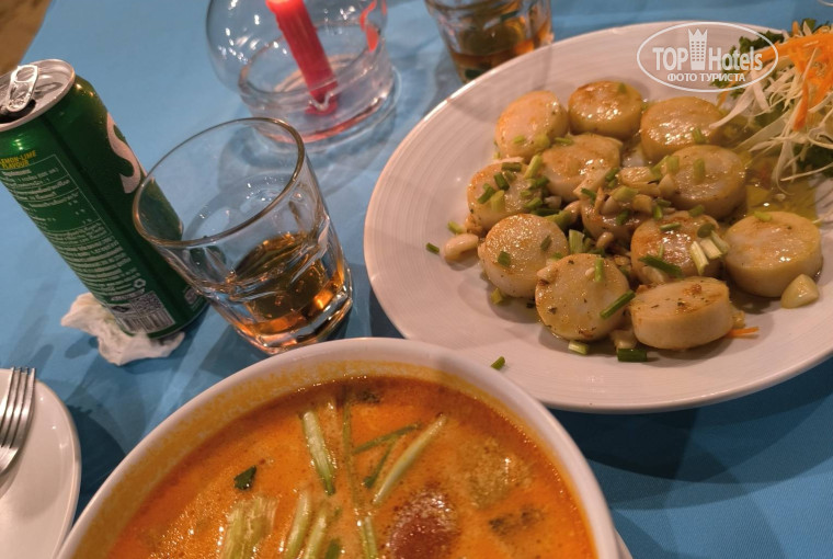 Обедали/ужинали в основном по местным кафе/ресторанам: Naiyang Center – или кафе с красным попугаем, рядом с ночным рынком (в сентябре попугай отсутствовал); Bakery and Coffee – или Голубая корова (тайская/русская кухня, кто соскучился борщ, пельмени, вареники); Boss Bar; Jack Beach Bar Restaurant – или Monkey, столы с синими скатертями – здесь самые вкусные и свежие гребешки жареные в сливочно-чесночном масле!; Mr Kobi Bar; Sea Beach Restaurant; Hi Beach, NY Beach Restaurant and Bar (проводят файер-шоу) – вообщем везде вкусно/разнообразно/выбор блюд очень большой/цены плюс-минус одинаковые, ходите пробуйте, наслаждайтесь.