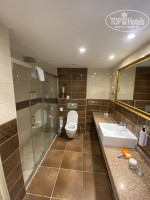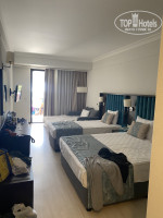 Отдохнули и поспали на диванах в зале. Переоделись и оставили чемоданы в холе отеля. В тур путевке у нас был номер эконом, как понял - это в верхней части отеля, в маленьких корпусах. Перед поездкой в отель списывался по вотсапу с менеджером сети отелей и просил предоставить нам номер после реновации. Не пообещали, а сказали информацию передали в отель. В 13.30 мы получили свой номер и он нас полностью устроил. Выход окна на запад, на аквапарк. Три кровати и диван, большая ванная комната. Чистое, свежее белье и отлично работающий кондиционер.
