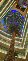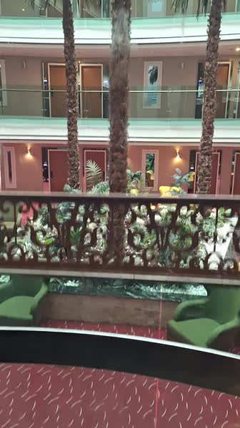 Всюду отель украшен зеленью живой и искусственной. На 1 этаже живые пальмы. Ростом до 7 этажа. Из главного лифта на них и открывается панорама. Эта зона в отеле, на мой взгляд самая лучшая. Вокруг пальм кресла жёлтого и зелёного цвета. Отлично сочетаются с клумбой. По фасаду этажа подсветка, которая меняет цвета, переходя из светлых к тёмным.