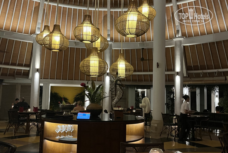 Завтраки шведский стол, не могу сказать, что очень разнообразные, но если жить тут несколько ночей, то этого вполне достаточно. Ресторан оформлен в стиле дома из деревни Вае Ребо, но из-за отсутствия стен утром у ресторана собирается стая воробьев (не раздражали, все блюда накрыты), а днем - стая мух (вот они раздражали). Мы брали завтраки и ужины, на ужин можно выбрать 3 блюда, по одному из каждой категории (стартер, основное, десерт), но порции настолько большие, что нам хватало и двух блюд. Кухня есть как местная, так и европейская. Напитки в ужин не включены.