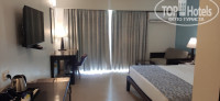 Я проживал во втором корпусе от ресепшена, в номере Делюкс с балконом и кондиционером, на последнем этаже (номер 214). В корпусе есть лифт. На входе, на первом этаже есть детская игровая зона с батутом, столиками и бильярдным столом, поэтому вечерами в корпусе довольно шумно. Номер большой, с двухспальной кроватью (над кроватью есть вентилятор) и маленьким диванчиком. В номере есть плоский телевизор с кабельным телевидением (индийские каналы), стол, холодильник, платяной шкаф с сейфом, чайник и чайная пара. Освещение в номере хорошее, электрических розеток достаточно. На косяки в виде болтающейся электрической розетки и заедающего сливного механизма туалета не обращал внимания. Ежедневно приносили 4 бутылки воды, чай, кофе, сахар и сухие сливки. Ванная комната совмещена с туалетом, там есть стационарный душ и ручной, сушилка (леска) для белья, диспенсеры с гелем для душа, шампунем и жидким мылом, фен и розетки для электробритвы. Вид с балкона на зеленую территорию и первый корпус. На балконе стол и два стула. Из минусов - крыша не закрывает часть балкона, поэтому при дожде мелкий мусор и листья будут на нем и на одежде (если оставили сушиться).
