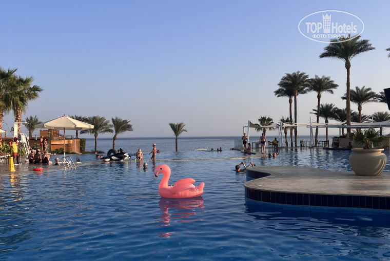 Территория отеля очень эстетичная, красивая, есть, что пофотографировать. На пляже и бассейне очень классные лежаки. Закрывают лицо от солнца, если это требуется. Нигде такого не видели, хотя были в разных отелях и странах. Бассейнов очень много, на пляже куча места, всегда свободные лежаки, с утра занимать не надо. Море очень чистое, красивое, много живности, риф хороший. Вид из номера на детский аквапарк, но мы не жалуемся. Ребенок ходил в детский клуб, там тоже куча всего ( в том числе батут). Аниматоры молодцы. Вечером есть анимация для детей, танцы и шоу. Наша дочь не ходила, уже взрослая для такого, но другим подойдет. Еда в отеле просто супер. Шведский стол обламывается. Куча еды, мяса, говядина, курица, перепелка, утка, рыба, разнообразные салаты, куча десертов и выпечки. Удивило количество овощей и фруктов. Нигде такого не видели. Аля-карт все рестораны попробовали, очень вкусно везде. Есть еще платные рестораны, но в них не ходили. Анимация с утра до вечера есть и для взрослых. Утром зарядка, водная аэробика, Дартц и водные другие активности. После обеда тоже есть чем заняться. Всегда приглашают на активности. Вечером после детского шоу танцуют для взрослых и поют на баре живой музыкой и песнями.Тут точно не соскучитесь