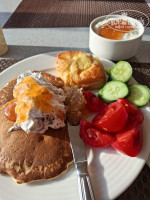 Хороший перекус в обед, в кафе на пляже, фрукты и мороженое.