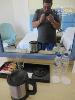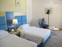 На 1-2 этажах - номера delux (мы оплатили именно такой). На 3-4 этажах номера premium (элитные). Нам достался номер 211 на 2-м этаже с видом на море, хотя за такие номера предлагают внести дополнительную плату. Наверное, роль в предоставлении такого номера сыграло сопроводительное письмо от TopHotels (у меня бронзовый статус) и небольшой подарок. А ведь я просил любой номер, с любым видом из окна, на любом этаже, лишь бы в нем не было до меня туристов, страдающих гнусным пороком никотинизма. В противном случае пребывание в номере превратилось бы в кошмар. Нам с женой повезло, как и нашим друзьям (их поселили с внуком в номер 209 с видом на город). В номерах 2-го этажа, где не выделяются помещения для табачных наркоманов, установлены таблички с запретом курения. Кошмарным застоялым запахом от курева не пахло. Не было также никакого застоявшегося «плесневого» запаха от ковролина (им застелем пол в комнате). В целом, спать можно в комфортной атмосфере, несмотря на то, что кондиционер «шахтного» типа (т.е. не индивидуальный), но не шумящий и хорошо регулируемый пультом на стене комнаты. Мебель никакая не обшарпанная (об этом написано в некоторых отзывах), вполне приличного вида, хотя и не новая. Кровати раздельные, с очень удобными матрацами и подушками. Для детей бесплатно предоставляют матрац, прикрепленный к металлическому каркасу (что-то типа кровати). А в турагентстве нам сказали, что за такую кровать для детей нужно доплачивать.