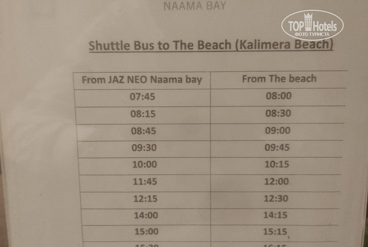 Пляж Калимера-Бич, расположенный в заливе Наама, предлагается бесплатно по билету на стойке регистрации. Автобус-шаттл курсирует между отелем и пляжем в течение всего дня, но напитки и еда на пляже доступны за дополнительную плату.