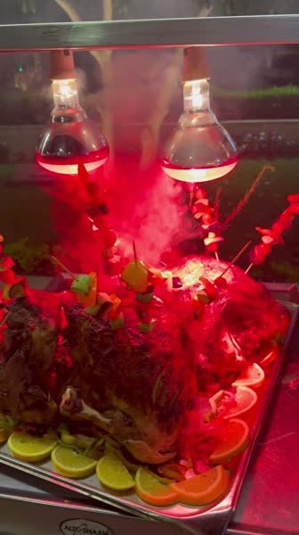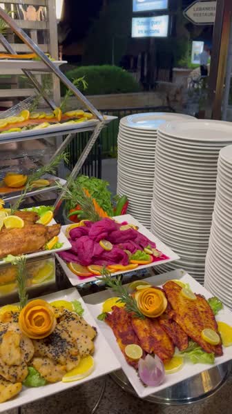 Мяса большой выбор, говядина, курица, утка, индейка. Говяжья печень просто🔥❤️долма , шашлык. Рыба всякая, какой только не было. Кальмары, креветки, осьминог это в рыбный день в большом количестве. Был день и роллы разные были, вкусные.