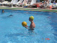 Следует сказать несколько слов о море, оно просто великолепно! Не верьте тем, кто написал, что в море водоросли - ложь чистой воды! Вода чистейшая! Только изредка после обеда может принести одну-две водоросли. В море не глубоко, заход неприятен только в момент переступания с плиты ( длится около 2-3 метров от берега) на песчаное дно. В воде очень много рыбок, морские ежи встречаются, только на камнях у пирса, так что не бойтесь за свои ноги :) Пляж довольно узкий, но протяженный. Можно было бесплатно бюрать катамаран или байдарку. Пляжные полотенца, под залог 1 полотенце=5евро. Каждый их можно было менять в турецкой бане. Волн на море было немного, скорее всего ввиду того что отель находится в небольшой бухте. Также когда идёшь на море через отель можно посетить несколько магазинов с сумками, продуктами, ювелирных, фотосалон, парикмахерскую, и там, где торгую сувенирами и майками. В бассейне плавать при таком море не очень хотелось, но раз уж зашла речь о нём, то скажу пару слов. Бассейн разноуровневый, глубины 2.40, 1.35, и кажется ещё какая-то :) Вода в бассейне чистая, но хлорированная.Лазил туда, только ради игры в поло.