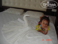 Прилетели 28 июня, отдыхали вдвоем.Дочке 2 года. Отель вполне соответствует 3+ по дизайну, чистоте. Начну с минусов: Территория отеля очень маленькая. Нет анимации. Бассейн просто втиснули. Лежаков возле бассейна помещается максимум 8-10 шт. Остальные лежаки расположены на 2 -м этаже. С едой конечно отель прихрамывает и конкретно, мне есть с чем сравнивать. Мы не привереды, поэтому голодными не оставались.Нам с дочей хватало. Что поразило, это наличие в обед и на ужин КОНТРОЛЁРА на раздаче "мясного" накладывал порции,как для дюймовочек. Мужчина при такой порции точно останется голодным.Хотя отель идет с шведским столом. Питание 3-х разовое, полдников и прочих карт. фри нет. Давали мясо кур, печень, рыбу, котлеты в сухарях, соевые сосиски, картошку, карт. пюре, рис, макароны и прочее. Десертов максимум 2 вида и только на ужин. На собственном пляже чисто, прям перед входом на пляж висит щит с угрожающим предупреждением , что на пляж запрещается приносить собственную воду, еду и фрукты. Но мы носили и пили, ели не боясь.Плюсы: Очень понравился пляж(мелкая и крупная галька) и море(чистое, вода изумительная). Идти до моря минут 15-20 медленным шагом. Лежаков и зонтов хватало всегда. Персонал состоит в основном из молодых парней в возрасте 22 лет, очень внимательные, если надо и пиво и тарелки принесут к столу.Привет Ахмеду и Мамеду! Уборка проводилась ежедневно, бельё меняли вовремя. Нам с дочкой в целом понравилось, главное ведь море, солнце, погода и хорошее настроение . Отель подходит для спокойного отдыха с маленькими детьми до 3 лет.