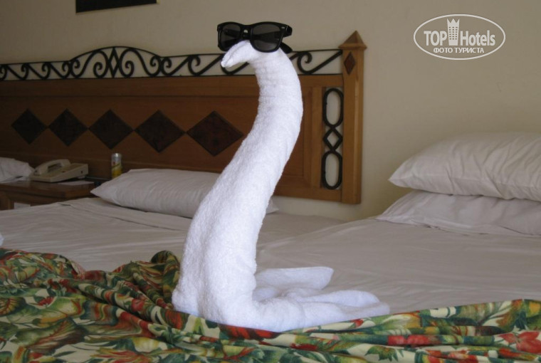 Нам досталась комната 1365 в 1 корпусе на 3 этаже. Комната большая, с тремя кроватями (я боялась, что поставят раскладушку), ванная комната тоже большая и в ней была ванна! (а не душевая кабина), правда неудобно, что душевая лейка вмурована в стену и напор воды очень слабый. Вид из номера был на бассейн и кусочек моря (номер оплачен стандартный). Убирали часа в 3 дня, если висела табличка "не беспокоить", не убирали вообще. Полотенца меняли каждый день, лебедей тоже каждый день крутили))) Мини бар пополняли, даже если там оставались напитки. Мебель старенькая. В номере все работало, телевизор - плазма (была проблема с изображением, но её быстро устранили).
