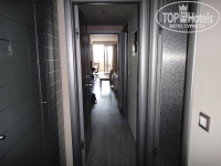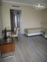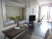 Наш номер состоял из: 1. просторной прихожей с двумя атаманками (размер этих диванчиков позволяет разместиться на них еще 2 человекам), тумбочкой со светильником, письменным столом со стулом и маленьким жк телевизором; 2. маленькой туалетной комнаты с унитазом, душем, раковиной и феном; 3. большой туалетной комнаты с унитазом, двумя раковинами, феном, ванной-джакузи (в стене рядом с ванной есть матовое окно в спальню); 4. коридора с двумя просторными шкафами, тумбочкой с чайником и чашками (прилагаются одноразовые пакетики сахара, сливок, кофе и чая), электронным сейфом (очень удобным в использовании и внешне весьма надежным), холодильником с мини-баром; 5. спальни с большой кроватью, двумя прикроватными тумбочками со светильниками, просторным туалетным столиком с большим зеркалом перед ним и напротив кровати, посменным столом и стулом, журнальным столиком с двумя оригинальными стульями; 6. балкона с двумя шезлонгами, двумя стульями и столом, а также с упомянутым выше бассейном.