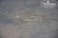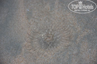 Был день когда вода сильно ушла заход в воду, мелкая его часть, соответсвенно сдвинулись. Гуляя в воде по щиколотку мы увидели медузу , вросшую в песок, круглая белая размером с яблоко, через несколько дней бегая по воде , бултыхаясь у меня ребенок увидел такую же , хоть я и проводила с ним беседы , ну куда там , конечно надо потрогать , я его фотографировала как раз в этот момент , когда он с обжаленным пальцем сообщил,- Мама меня медуза укусила и показывает мне палец, так что фотографии этой медузы есть , все выложу далее.