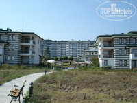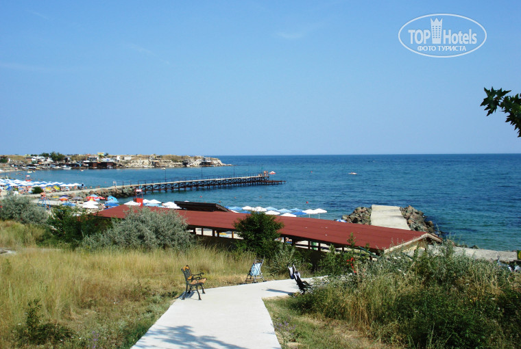 Вечером надували большие резиновые горки, где дети с удовольствием прыгали. Родителей с детьми в отеле отдыхает много, днем вся дорожка при подходе к пляжу уставлена колясками. Берег – белый песок, дно чистое, правда, несколько дней к вечеру наносило зеленые водоросли, но к утру было чисто. Пляж тщательно убирается каждый вечер. Очень красива ночная подсветка зданий отеля и бассейна – все сверкает зелеными огнями. Вокруг находится зеленая территория, к пляжу надо спуститься по бетонной дорожке, но это не утомительно и занимает несколько минут. Пляж небольшой, песчаный, имеет каменные пирсы. Постоянно дежурят спасатели. В описании отеля перед поездкой я прочитала, что возле бассейна бесплатно лежаки, надувные матрацы, надувные подушки и мячи, так вот бесплатным из всего оказались лишь лежаки и зонты у бассейна, так как у моря они платны – по 3 лева, у бассейна – бесплатные и их в достаточном количестве, когда бы мы ни пришли – у бассейна всегда были свободные места. Лежаки деревянные, вокруг естественная зеленая ограда, дающая приятную прохладу и, что особо понравилось - душ у бассейна имеет не только холодную, но и горячую воду.