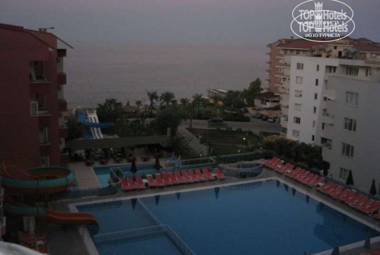 Теперь о кухне. Я не притязательна, так что сильно жаловаться не буду. Из офощей только огурци ела, помидоры никакие вообще. вот горячее у них есть что выбрать и голодным никогда не останешся. Завтрак с соевой колбасой тоже ничего,но это для меня потому что я утром обычно пью кофе и всё. А вот фруктов действительно нет. Есть арбуз и дыня и всё. Никаких тебе яблоков и апельсинов, бананами вообще не пахнет,потому что они у них оказывается очень дорогие для турков,несмотря на то что в Аланьи их выращивают. Ну яблочков я и дома поем,так что сильно не огорчилась. Народ в отеле активно поедал арбуз, я так и не поняла что они в нём нашли,ведь он никакой, не аромата не сладости. Вот дыньку скушать можно. Официанты умнички, летают как истребители, и без спроса ничего не уберут. Так что кто писал,про гадов официантов,то в этом они исправились. Бармены, вот эти извиваются как ужи. Мало того они разбавляют водку. Ну это предел,если бы пили их водку не разбавленную, не в одном глазу,а тут её ещё и разбавляют и наровят льда кинуть. Нет цели упиться как свиньи у нас не было, но просто выпить за ужином и то нечего было. Вино я пробывала один раз,вообще никак,а от пива извините изжога.Так что берите с собой положеные вам 5 литров и не порте себе настроение. Хотя сами по себе бармены милые ребята,просто им влетает за то что некоторые русски умудряются напиться от их пива и доставать весь персонал отеля. Была там одна семейка, прозвали мы её Семейка Адамсов. Пили круглые сутки кроме завтрака. Ну дикари. Поэтому и водку наверное стали разбавлять. Вот в Лобби баре народа нет вообще, но духота там страшная, кондишн не включается вообще и водку там не мешают ))). Бармены по русски понимают очень плохо,а вот по английски легко. Так что учите английский народ.