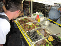 Это однообразие с лихвой компенсировал наш ежедневный обед на пляже в широко известном кафе тех мест "РАЗВАЛЮХЕ" (по пляжу налево третье по счету кафе, проверенное десятками тысяч россиян)))))) Обед на 8 человек с шашлыками, бутребродами, макаронами и колой обходился в среднем 1200рублей. Ужинали или на фудкортах БигСи - где заставали вечерние дела или на площадке отеля перед бассейнами - с 19 до 21 открывалисься палатки с разными национальными кухнями. "комплексная тарелка" отбивная+картошка+овощи 130-150 рублей. Напитки свои - из магазинов. Те кафешки, что через дорогу - не понравились. Особо голодным можно с пользой для здоровья наедаться фруктами - они до поздней ночи продаются в сувенирных рядах очищенные, упакованные, охлажденные по детским ценам.
