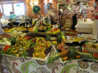 Далее ресторан. Хотя я бы назвала столовой. Находится на -1 этаже, соответственно окон нет. Помещение маленькое, столики стоят близко друг к другу, можно есть и задевать локтем сидящего рядом человека. При входе в ресторан предъявляешь карточку, ее сканируют и провожают к свободному столику. Питание лично мне показалось однообразным. Практически всегда на завтрак/ужин одно и тоже. Правда 1 раз был мексиканский тематический ужин. И еще 1 раз давали блинчики на ужин. Очень маленький выбор фруктов. На завтрак приносят растворимый чай или кофе в чайнике. Это если вам повезет, и официант сразу вас заметит. Нам же практически все дни приходилось ждать пока к нам подойдут. В первый же вечер, к нам очень и очень долго не подходили, и на просьбы не реагировали. на что я не выдержала и пожаловалась администратору. через 5 сек вода была у нас на столе. И потом официанты смотрели на нас ненавидящим взглядом. Из ресторана ничего нельзя выносить. даже маленькое яблоко. Еще был случай, стоял торт, и мы хотели взять кусочек. На что подбежал администратор Хосе, и чуть ли нас не оттолкнут закричал Private! то есть этот торт был только для немцев. Вообще чувствовалось отношение к русским как к второму сорту.Можно поменять ужин с обедом. На обеде более спокойнее, работает другой администратор, ассортимент еды то же что на ужин.