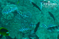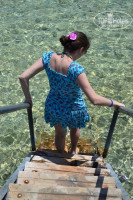Есть аквапарк, бассейн с подогревом,пляж. Что бы искупаться в море нужно пройти по понтону и спуститься вниз,вода где то по пояс. Вокруг тебя плавает куча красивых рыб, их видно и без маски,так как вода очень прозрачная. Если зайти в море с берега,то вода будет по щиколотку и идти придется очень далеко,что б вода стала хотя бы по колено.