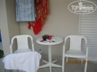 Отель представляет собой двухэтажные небольшие корпуса,с террасами на первом этаже и балконами на втором,мы жили на первом.В принципе,мы были очень довольны и номером и его расположением,потому что после предыдущего отеля,нам казалось,что мы в раю.Теперь, по прошествии времени, я бы наверное хотела жить на втором этаже,т.к. различные насекомые,а так же цикады, так и норовят прошмыгнуть в номер,поэтому приходилось вечерами очень быстро плотно прикрывать дверь, когда выходишь на террасу.