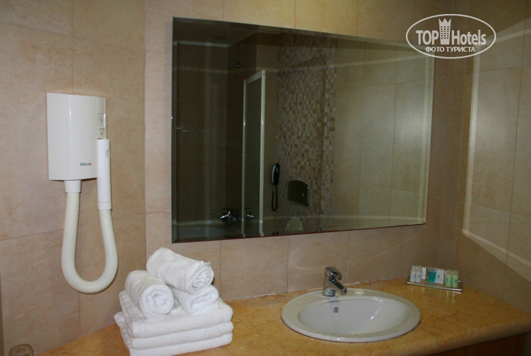 Минус один балл за размещение – за санузел. Хотя сантехника и новая, и вроде все отремонтировано, но ремонт сделан неаккуратно, швы замазаны кое-как, в общем, вид немного неряшливый. После принятия душа на полу стабильно образуется лужа, причем подтекает откуда-то снизу из-под ванны, я так поняла, это вообще беда этого отеля. Крючков и полок для полотенец нет. Держатель для душа болтается на честном слове, вот-вот отвалится. И дверь в ванную снизу потемневшая от сырости –видимо, не меняли во время ремонта.