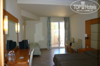 После обеда, где-то в половине второго, получили ключ от номера. У нас был забронирован Superior room (ездили от оператора Лабиринт). Номер достался на втором (фактически третьем) этаже основного корпуса, в тихом месте, с видом на территорию и боковым видом на море. Номер оказался неожиданно просторным, со свежим ремонтом. В нем практически всегда было приятно прохладно, даже кондиционер не включали на ночь. Кстати, кондиционер работал и при открытой двери балкона, и вообще, электричество в номере было всегда, не надо было оставлять карточку-ключ. Но может быть, это временно – в отеле идет перманентный ремонт, замена замков в дверях и т.д. Мебель в номере не новая, но в общем вполне приличная, матрасы на кроватях новые. Плечиков для одежды в шкафу полно. Имеется журнальный столик и два кресла. Телевизор показывал (3 русских канала), кондиционер работал исправно. Большой балкон, на котором приятно посидеть вечерком с бокалом вина :).