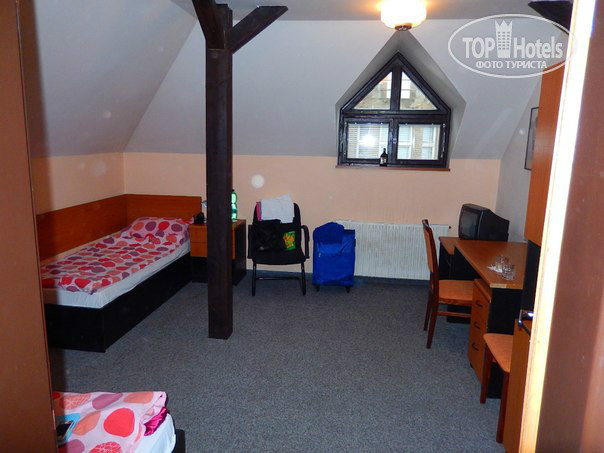 Номер достался в крыле здания со скошенным потолком, так что это придавало некий шарм, пожалуй, как будто вы приехали отдыхать на дачу. уютненько) Мебель самая необходимая, офисного типа, но, тем не менее, довольно новая. Также в номере был телевизор с парой русских каналов.