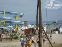 Его полное название "Иберостар Феста Панорама&SPA Центр" (SPA центр, естественно, есть, находится на нулевом этаже). Прекрасный компактный отель (территория, увы, "от фасада до фасада"), стоящий прям при въезде в Несебр. Собственного пляжа нет, да и стоит от моря формально на 2-й линии через променад (здесь катается туристический паровозик до крепости, 3 Лв взрослый и 1 Лв ребенок) от каменного обрыва. Общественный пляж метров 250 вправо вниз, вход бесплатный, а вот зонт стоит 7 Лв. Со своими зонтами можно, но нельзя пересекать веревочку ("приватна зона"), сдерут те же 7 Лв. Зато на пляже есть аж 2 водные горки: 1 спуск- 1 Лв, оптовикам скидки-10 спусков-6 Лв. Море средней паршивости, метров 300 будет по колено, а с маской ловить вообще нечего.
