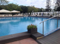 Территория красивая, зеленая. Внутри отеля зал нормальный тренажерный, бассейн закрытый теплый. Снаружи большой открытый, но мне показался неглубоким. Приложу к отзыву фотографии. Здания с виду совковатые, избалованным любителям Египта и Турции может не понравиться.