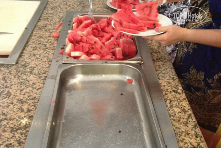 - Один из главных минусов отеля это питание. Оно скорее подходит для вегетарианцев: мяса практически нет, вместо него на обед и ужин соевые котлеты каждый день, иногда была курица в виде крылышек и окорочка на гриле/донер раз в несколько дней. За две недели один раз готовили тунца на гриле, но его как специально пережарили до состояния угля. Пожалуй, только завтрак является полноценным: омлет, оладьи, каши и пр. к нему особых претензий нет. С фруктами тоже напряженно - лишь арбуз каждый день, чуть реже дыни и яблоки и всё... Сладкое всё отвратительное, что получше разлетается за 1-2 минуты после открытия (причём некоторые сразу отхватывают по 5-6 кусков). В итоге питание сводилось к огуречно-помидорной диете (да и через полчаса после начала ужина их было не найти) + макароны/рис/картошка фри.