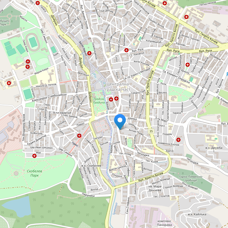 Отель расположен в центральной части города Плевен, в 3 км от парка и заповедника Кайлака. Главная станция железнодорожного вокзала находится в 5 км от отеля.