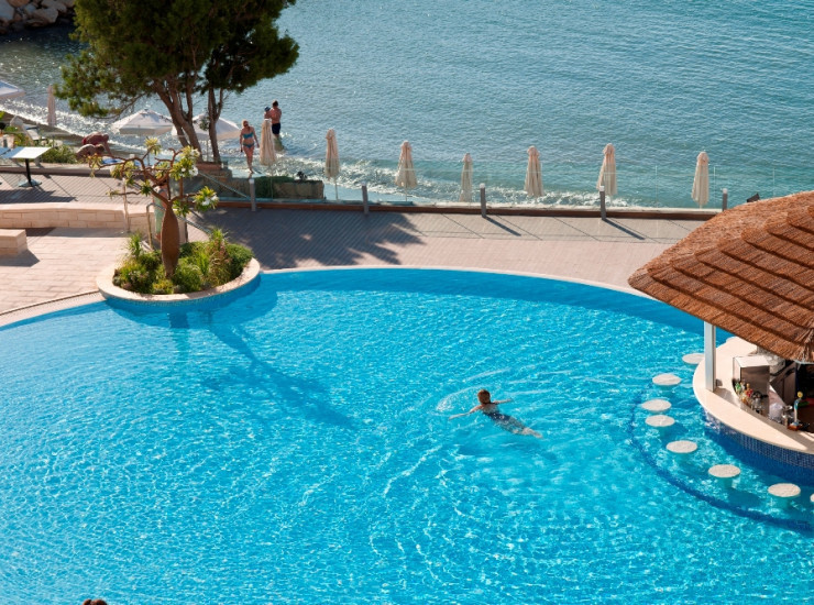 As the name suggests, the Ocean Blue is a few steps from the calm waters of the Med. And half of the bar is actually within the large island shaped swimming pool. The Ocean Blue serves drinks and snacks throughout the day to our guests around the pool and on the beach. Opens from May till October from 10.00-19.00