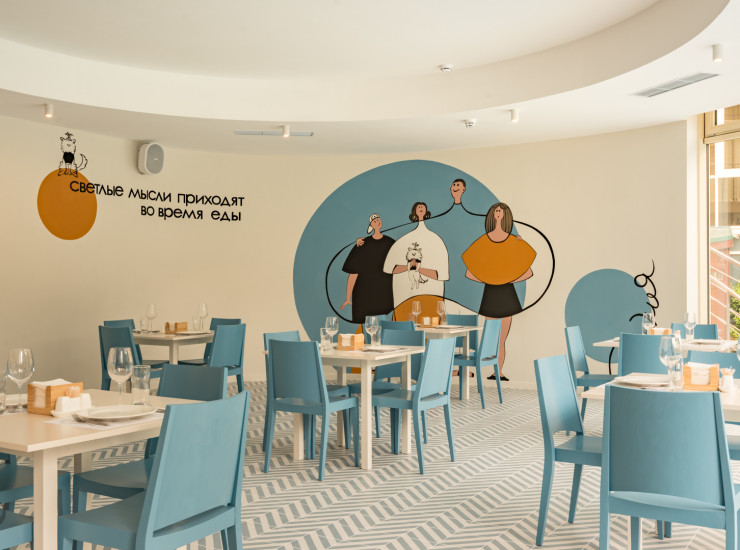Расположен в корпусе 1 на первом этаже, здесь проходят завтраки, обеды и ужины по системе "шведский стол".