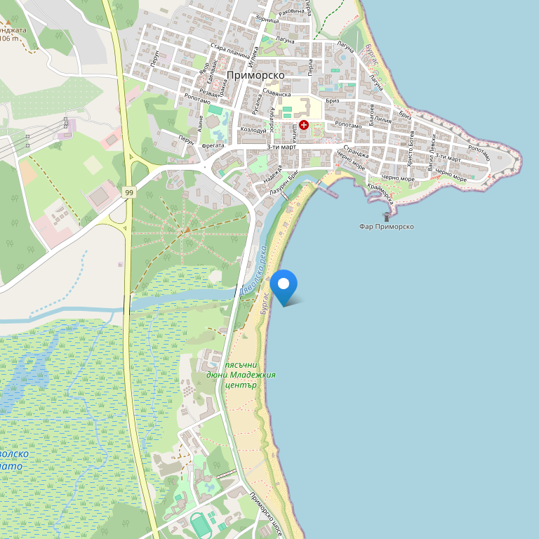 Отель расположен в центре города, всего в 150 метрах от южного пляжа, в непосредственной близости от аквапарка Приморско.