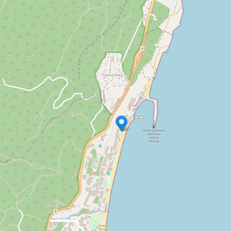 Гостиница находится в 500 м от моря, в 100 м от курортного комплекса Золотые пески и в 13 км от гор и предлагает прекрасный панорамный вид на море. Она достаточно удалена от шума курорта, чем обеспечивает максимальное спокойствие и уют своим гостям. В непосредственной близости находится Природный парк «Золотые пески» – уникальное сочетание между морским климатом, солнечными пляжами и вековым лесом.