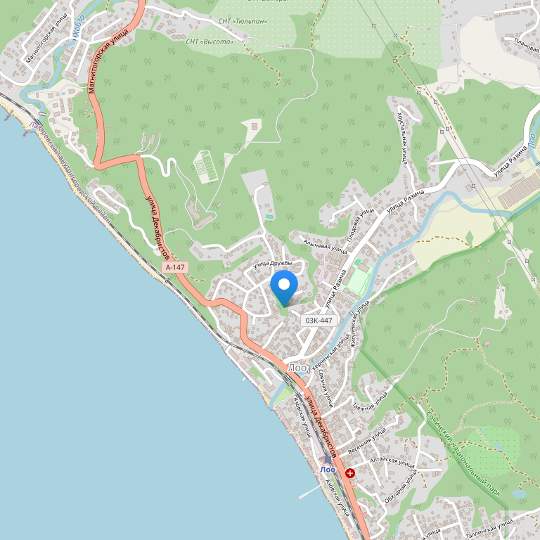 Отель расположен на Черноморском побережье, рядом с пляжем, неподалеку от кафе и магазинов, на расстоянии 5-ти минутной поездки от аквапарка «Аквалоо».
